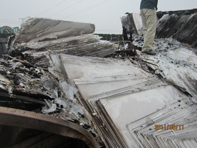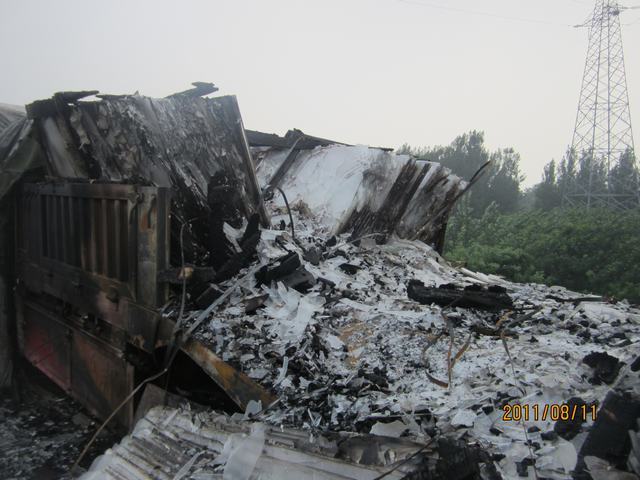 中国物流联合运输协会 物流企业国内公路货物运输保险条款 真实理赔“案例第21起” 被保险单位:山东省烟台市 李俊 被保险人:李俊 出险时间:2011年8月11日; 出险地点:山东金山高速; 出险原因:轮胎突然自燃,导致车上货物80%烧毁; 现场照片 (1) (2) (3) (4) (5) (6) (7) 中国物流联合运输协会“温馨提示”: 挂车自燃的原因及预防措施 随着国内物流的高速发展和道路建设的日趋完善,半挂车运输在经济成本上的优势变得愈发明显。但因挂车的制造质量、使用和配置的问题,引起半挂列车在运行中自燃事故屡见不鲜。挂车作为大型的运输载体一旦出现自燃,直接财产损失动辄上百万甚至几千万元,甚至会危及生命安全和社会安全;因此,了解挂车自燃的原因,在相关方面做好预防措施是非常必要的。 挂车是一台完整的结构,承受着装载货物的主要重量,但不具有动力机构和操纵机构,挂车的牵引力、制动源和信号等都是由牵引车提供,所以挂车各机件与牵引车有很大的不同。一般汽车由发动机过热、燃油泄露等原因引起的自燃,在挂车上是不可能出现的。 挂车自燃的原因 1. 轮胎的自身结构和轮胎的使用、选配问题 (1) 由于轮胎的橡胶和轮胎内的压缩空气都具有弹性,汽车的重量会使轮胎接触地面的部分产生一定量的变形,车辆运行时轮胎滚动会使轮胎周围产生交替变形。另一方面车辆运行将产生一定振动,致使轮胎在不同的时间产生不同的变形,轮胎内的空气也就在不断压缩和膨胀中做功发热。 (2)轮胎式有一层层橡胶和钢丝或尼龙骨架程构成的。在车辆运行中,轮胎不同部位的橡胶因受力情况的变换也在不断挤压和摩擦。这种挤压和摩擦是使轮胎内部产生热量的主要根源。加上橡胶是热的不良导体,积聚在轮胎内部的热量不易散发,车辆在持续运行中,会使轮胎胎体内部的热能越聚越高,直至达到燃点而引起燃烧。气压不足、总载和高速车辆因轮胎的变形量大和变形频率高会更加容易出现轮胎高温,还有,夏季气温高和路面温度高也是加剧行驶轮胎温升的重要原因。 (3)轮胎在运行中爆裂或泄气,一方面使轮胎与轮毂、轮胎与地面摩擦产生高温;另一方面,只要两轮胎中有一个跑气就会发生这种现象,由于相邻的车轮承受了两倍载荷而形成过载,因此导致轮胎摩擦过热。 以上3点都是造成轮胎在运行中滋生产生热量的原因,当轮胎温度高于橡胶的自燃点(120℃)时,轮胎就会起火自燃。 2. 制动系统的非正常使用或故障,使轮胎拖刹或抱死 当长时间制动或制动出现非正常托刹是,制动鼓产生高温对轮胎烘烤,使轮胎产生高温,制动抱死时,轮胎与地面急剧摩擦产生高温。当温度高于橡胶的自燃点(120℃)时,轮胎就会起火自燃。制动系统的故障部位包括管气路、阀体及制动力传动、执行机构。 (1)管气路、阀体又可分为行车制动、驻车制动2部分 。行车制动:主车制动阀渗气、紧急继动阀故障,表现在挂车的所有车轮可能出现拖刹或抱死;驻车制动:供气管漏气、储气罐漏气、驻车手控阀漏气、快放阀漏气、制动气室储能腔漏气等都会造成轮胎拖刹,表现在装有双腔气室的车轮出现拖刹或抱死。 (2)制动力传动、执行机构:制动力传动机构缺油无润滑、受到撞击时机构变形、回位弹簧失效或断裂等都会造成制动力传动阻滞过大,制动回位慢甚至不回位。 3. 轮毂系统损坏而发热或抱死 (1)轴承损坏,滚道干磨产生高温,点燃轮毂里面的润滑油。 (2)轴承损坏,滚子卡死轴承,轮子抱死,是胎面与地面摩擦急剧产生高温,轮胎起火自燃。 (3)轴承损坏后,其上的自动鼓失去定位,制动鼓常与蹄片接触摩擦,产生热量。 4. 电路线束、电器元件的低质化合安装不规范线,是线路故障引发的自燃事故原因之一 国内一些挂车厂通过采用低廉价格吸引用户的手段来提高市场竞争力,为了降低成本获取一定的利润,它们往往会采购一些质劣价廉的配件装配挂车,其中也包括电路线束、灯具等。这些线束和灯具在使用中容易出现漏电短路现象,加上这些厂家的技术水平有限,它们不会去分析车辆的线路布置和具体的结构,而是随便乱接乱引电线,易摩擦处也未有效固定等,这就给车辆的自燃事故发生埋下隐患。